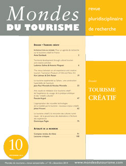 Mondes du tourisme est une revue pluridisciplinaire de recherche. Le dossier ce numéro de Mondes du tourisme, dirigé par Anne Gombault, s'intéresse au tourisme créatif.