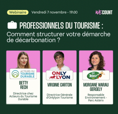 Le vendredi 7 novembre à 11h30, We count organise un webinaire avec les Acteurs du Tourisme Durable (ATD), le Parc Astérix et Only Lyon Tourisme et Congrès pour présenter des exemples de démarches de décarbonation dans le secteur.